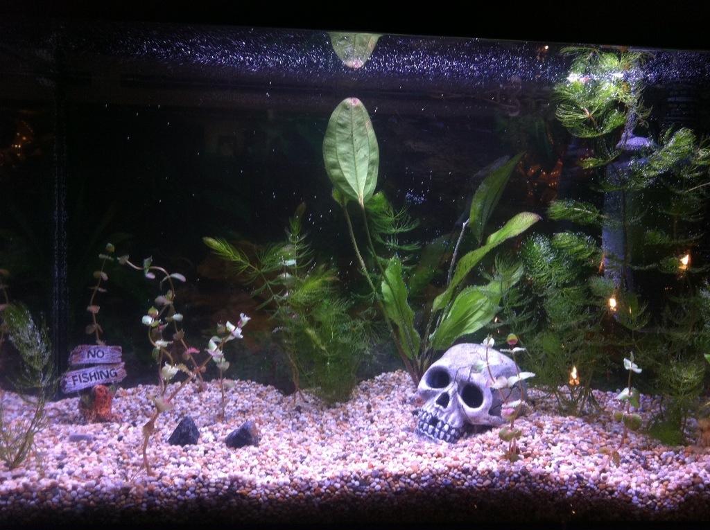 Idag var vi en tripp till Zoo affären Arken i Kungens Kurva, vi fick jätte bra hjälp med vad vi skulle köpa till vårt akvarium. Så nu har vi bakgrund och växter, en dödskalle och en skylt! Hur fint som helst!! Måste säja att jag börjar mjukna när det gäller akvariet. Från början tyckte jag helt att det var Roberts område, men nu när vi dekorerat det och det är supermysigt att titta på.. Och då har inte några fiskar flyttat in ännu. Först ska vattnet få rätt ph-värde och klarna lite!