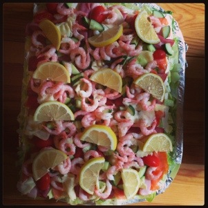 Vi började med en (iaf för mig) stressig förmiddag, smörgåstårtor skulle läggas och göras klart, skalas räkor, dekoreras och allt! Jag tycker iof att det är väldigt roligt, men stressar ju ihjäl mig för allt jag tar för mig 😉!!