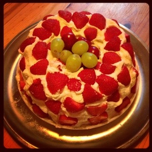 Veronica bakade en god tårtbotten och gjorde en supergod jordgubbstårta till kvällen..