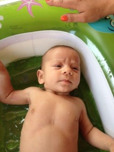 Innan badet, så fick han ligga naken ute på altan i babygymmet och sparka och ha sig.. Tror han låg nästan en timme..