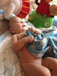 Där låg han så fint så länge, men självklart när jag tog upp honom, så kissade han ner mig(!) men vad gör väl det egentligen, bebiskiss är som vatten.. Bara byta om och se glad :)!