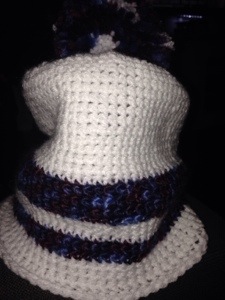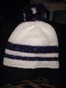 Hon ville ha en vit mössa med lila deko.. Tyvärr hade jag ingen lila så det fick bli melerat garn, och det godkändes!