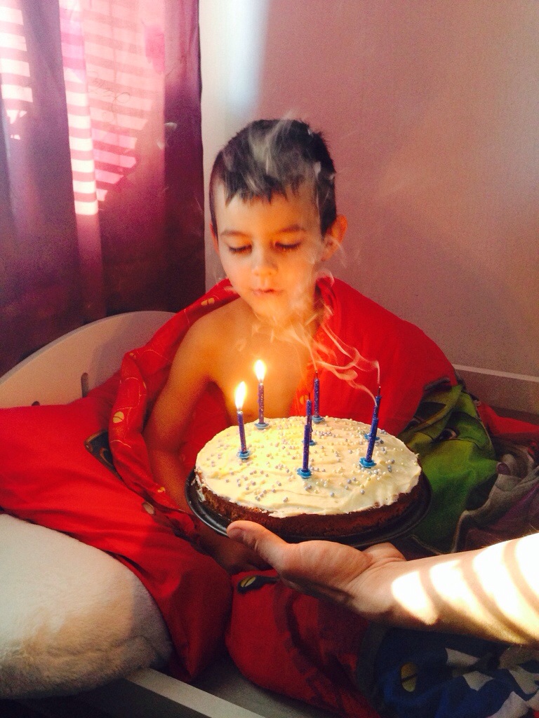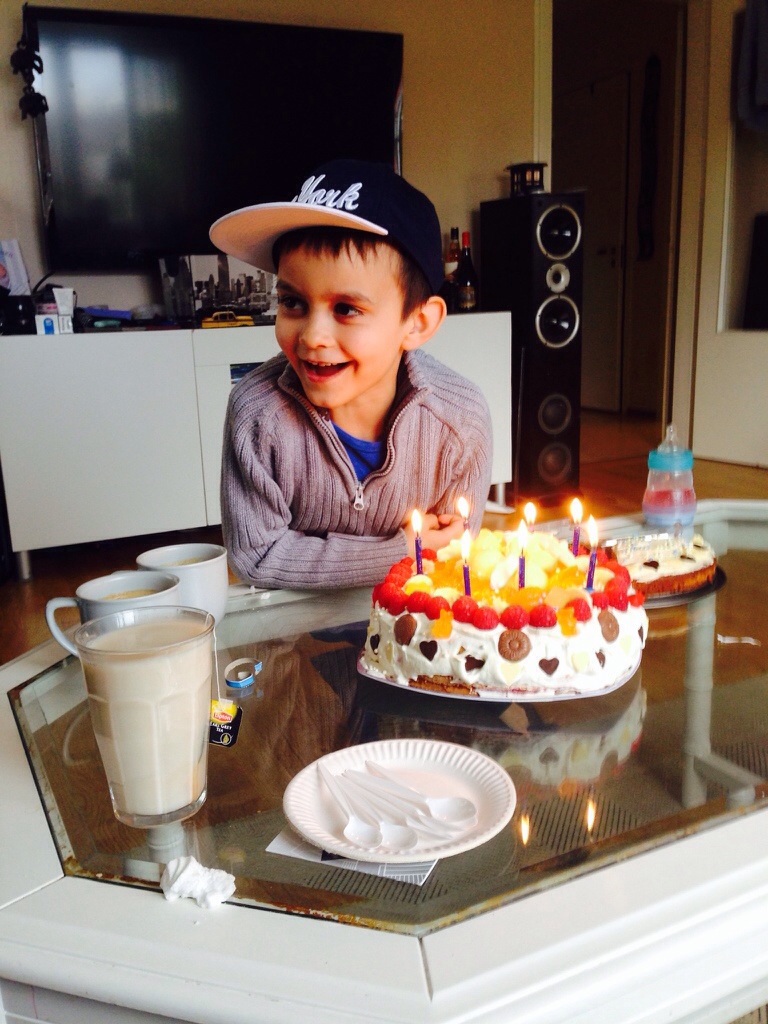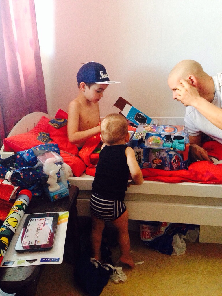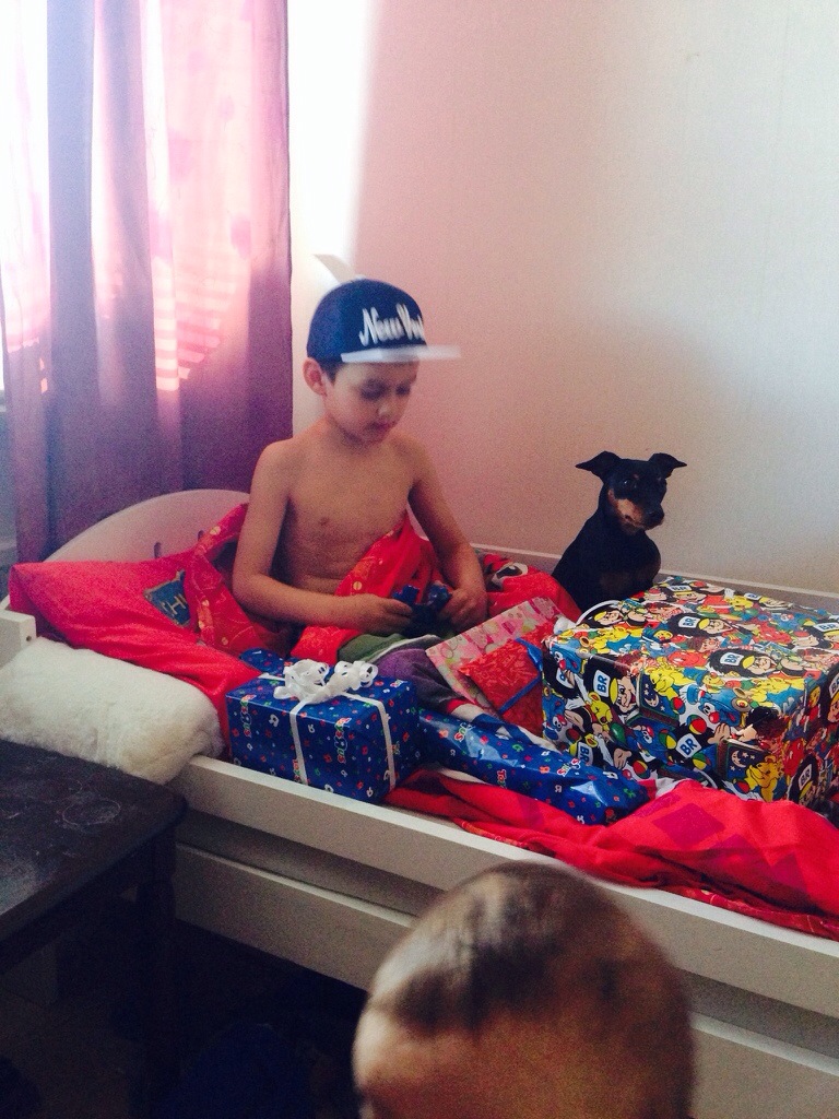 Började vid 8 med att ”väcka” en redan vaken och förväntansfull kille med sång, paket och fika på sängen!
