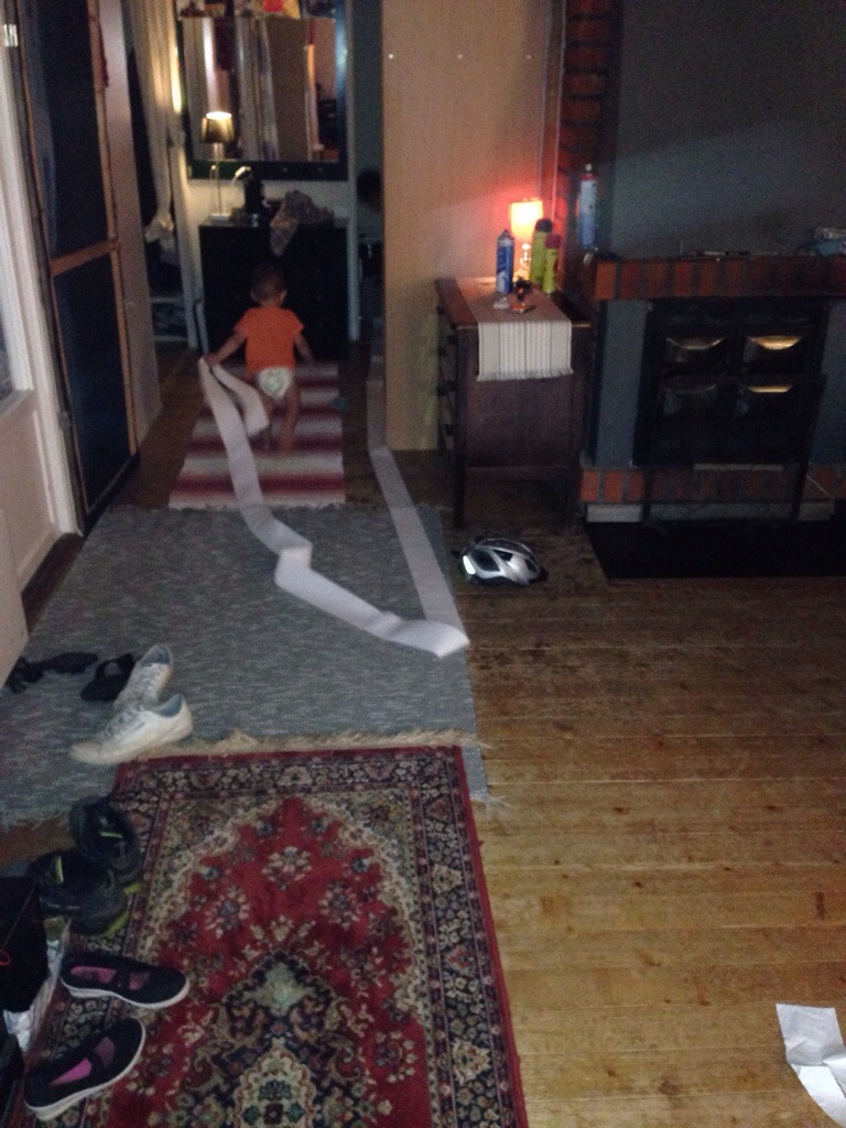 Framåt 19,30 hittar han toarullen inne på toa såklart och kommer tjutande ut i vardagsrummet med pappret i släptåg, det är väldigt svårt att vara allvarlig i den situationen!!