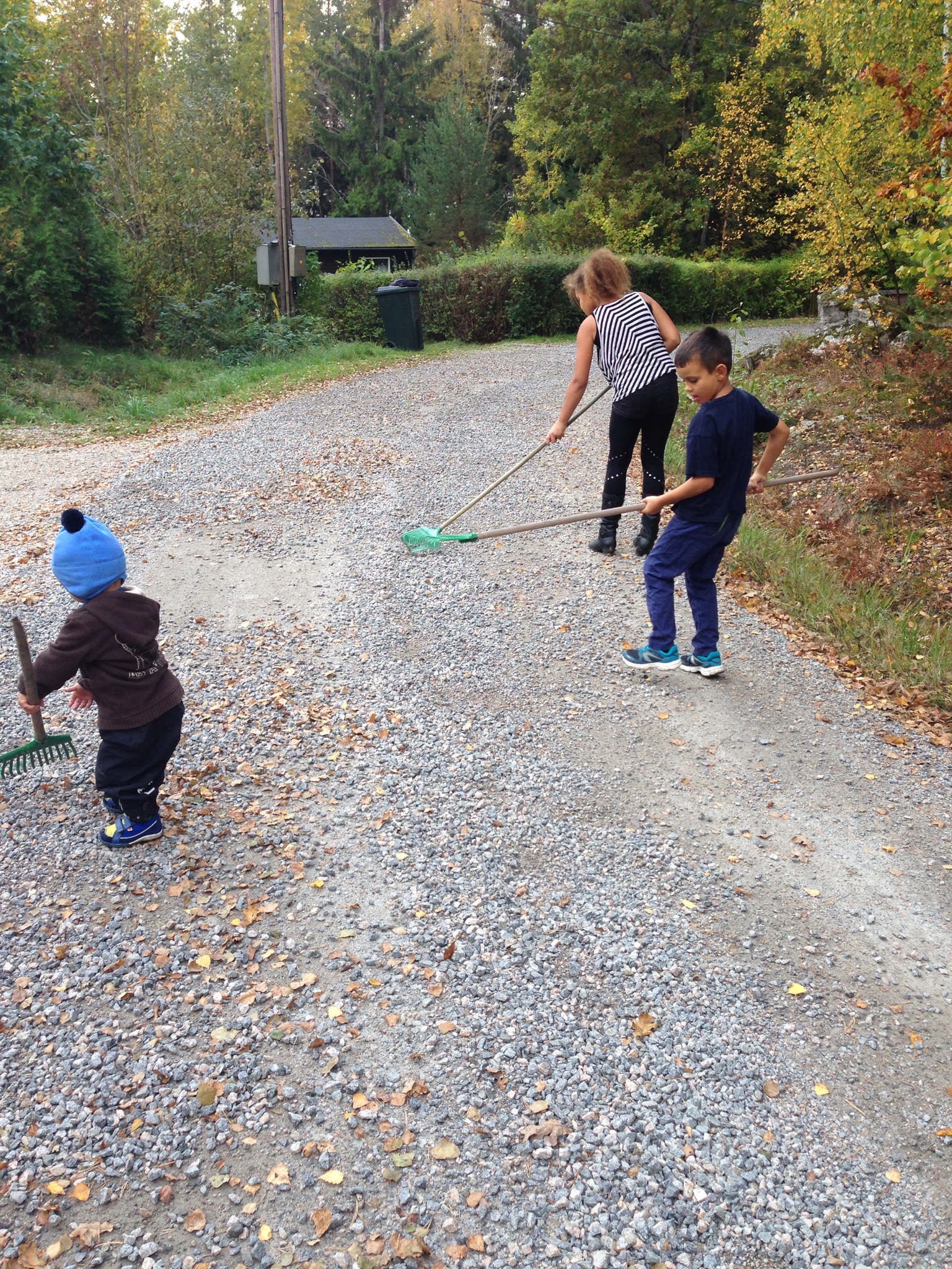 Idag vid 10 tiden stod vi allihopa uppe på vägen och krattade upp gruset från vägkanten upp på vägbanan igen, så kanske föreningen slipper betala för nytt grus till vägen så ofta!!