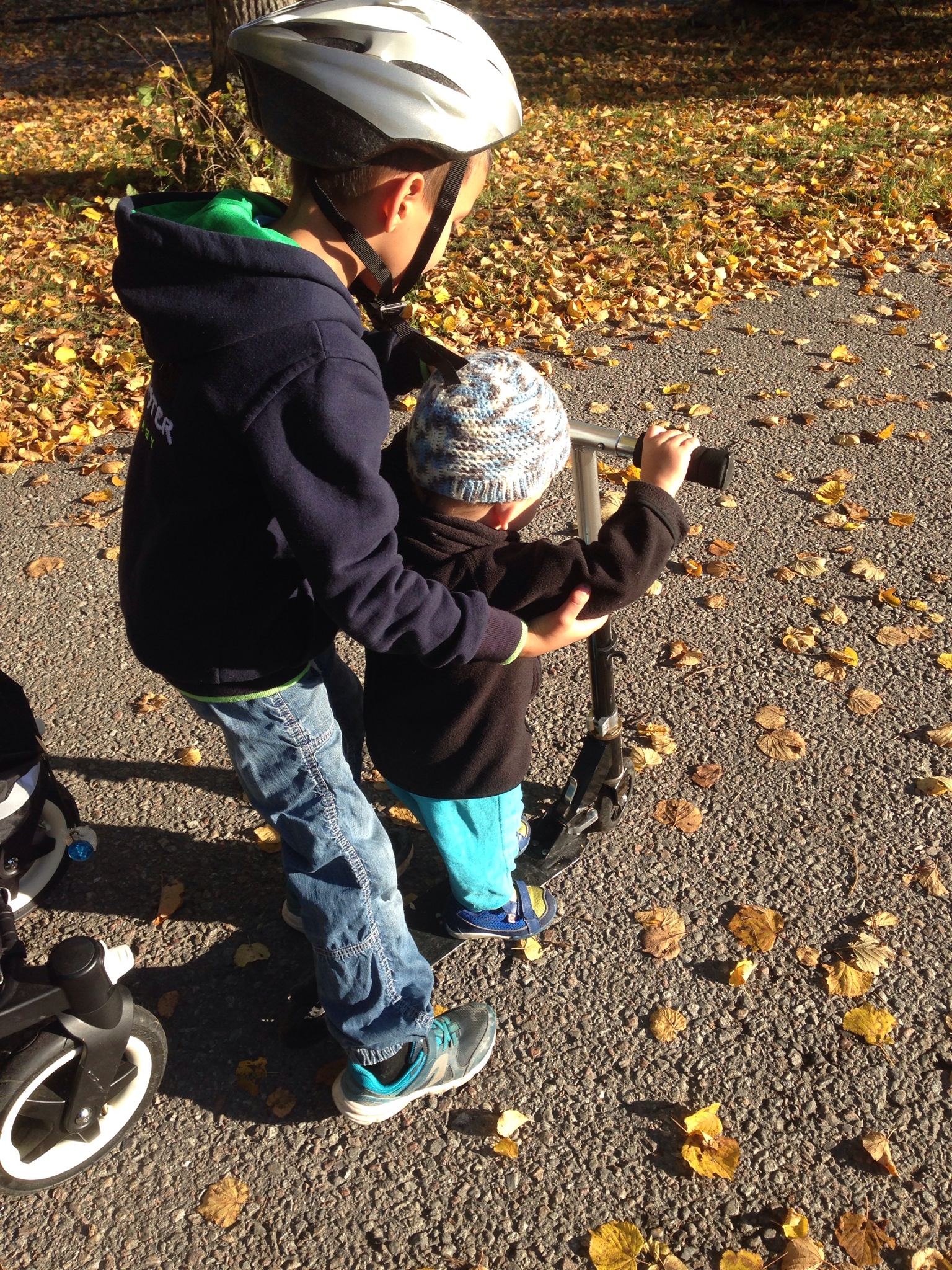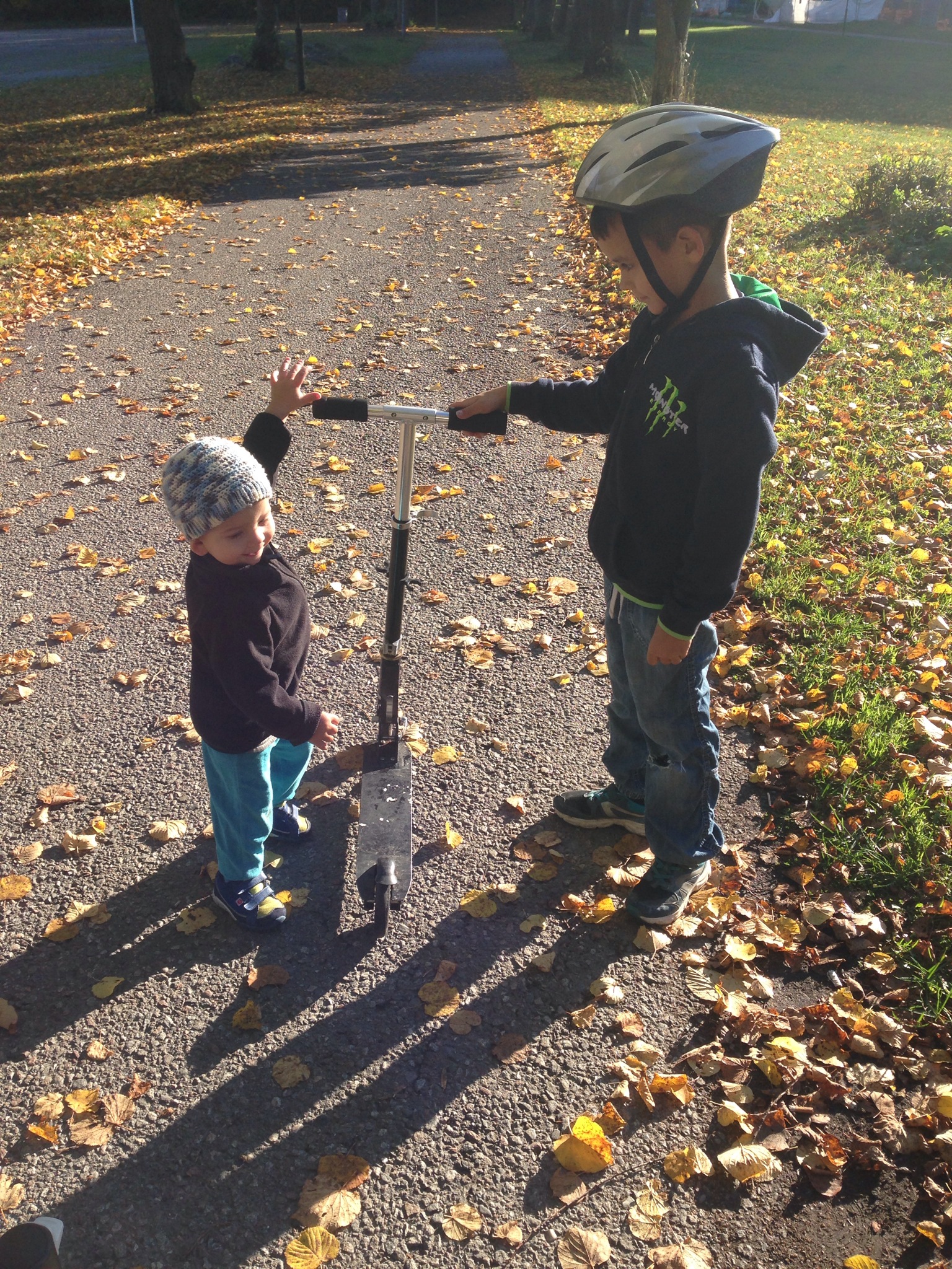Så envis liten Max! Han skulle pront åka på Noels spark, och Noel är snäll nog att låta honom 💙