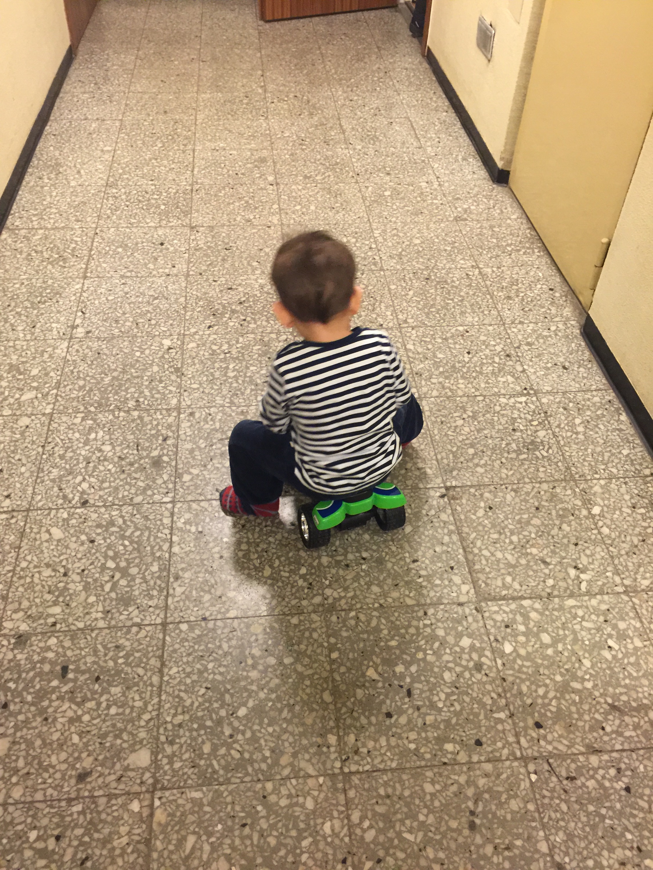 Det är ju inte meningen att man ska sitta och åka på den, utan det är en radiostyrd fyrhjuling som Noel fick av Familjen Lodefall i födelsedagspresent för ett par år sen!