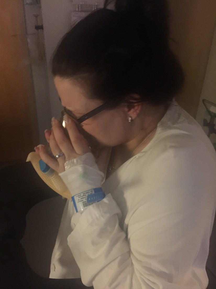 Sen är det luddigt, får ganska snabbt lustgas då jag ber om det. Öppen 4,5 cm. Med lustgasen kan jag lättare gå igenom värkarna & även stå och gå. Men efter bara någon timme ber jag om Eda.