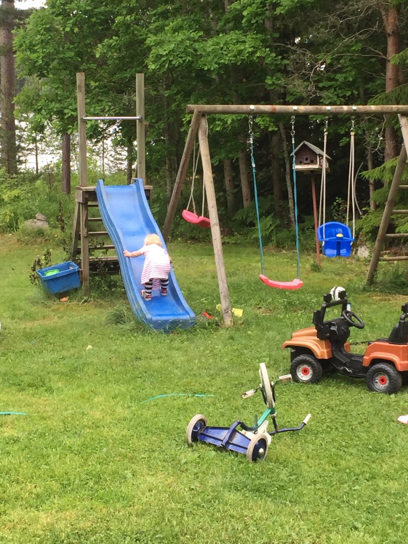 Men nog med klag!! Vi har det ändå underbart på landet! Önskar att solen kunde skina och värma mer på dagarna! Skulle vara roligt att få lite färg! Igår var vi ute och promenera kring Ekudden/Grind. Gick till en badplats som iaf jag aldrig varit på tidigare, och då har jag ändå varit här i 16 somrar.. Sara passade på att bada, vovvarna drack vatten, Masken & Mormor tittade på fiskar i vattnet :).. Noel lekte med Sara 🙂