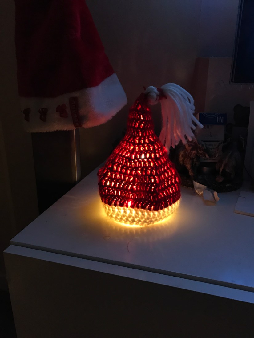 Har idag på eftermiddagen virkat på en tomteluva till Sigge. När det årliga julkortet ska tas på barnen så vill jag att dom ska ha tomteluvor men Sigge har ingen så jag virkade ihop en själv. Men den blev precis exakt för liten! Då kom min man med den brillianta idén att den kunde bli en ”lykta”. En tomtelykta