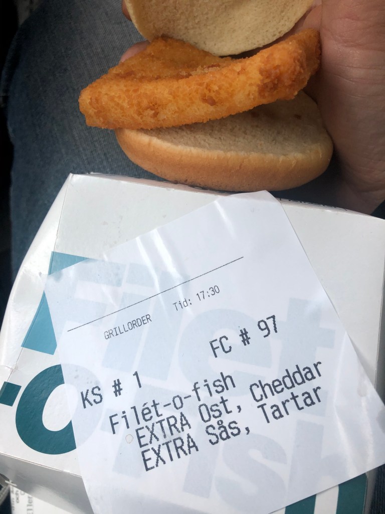 Så, mat beställd till en familj på den lilla summan av 7 personer. Vanlig och inga konstigheter i beställningen, förutom att McDonalds tjänade några extra spänn på att Jag ville ha extra CHEDDAR och extra tartarsås på min fiskburgare! Alltså den känslan, att få en fiskburgare och LÄNGTA efter mat, vilket jag inte gjort senaste veckan.