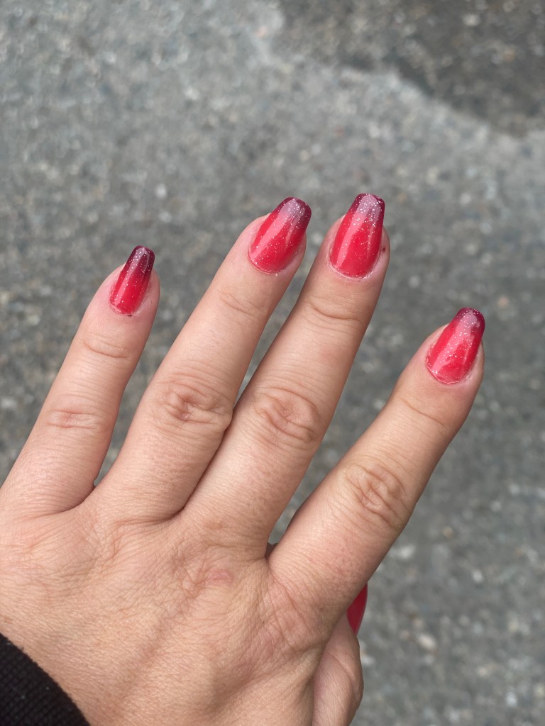 Den här skiftar mellan ljust rosa till stark rosa, vidare till stark cerise och över till klarröd, sedan mörk röd över till lila. Jag älskar just att vid kyla är den mörk & värma ljus.