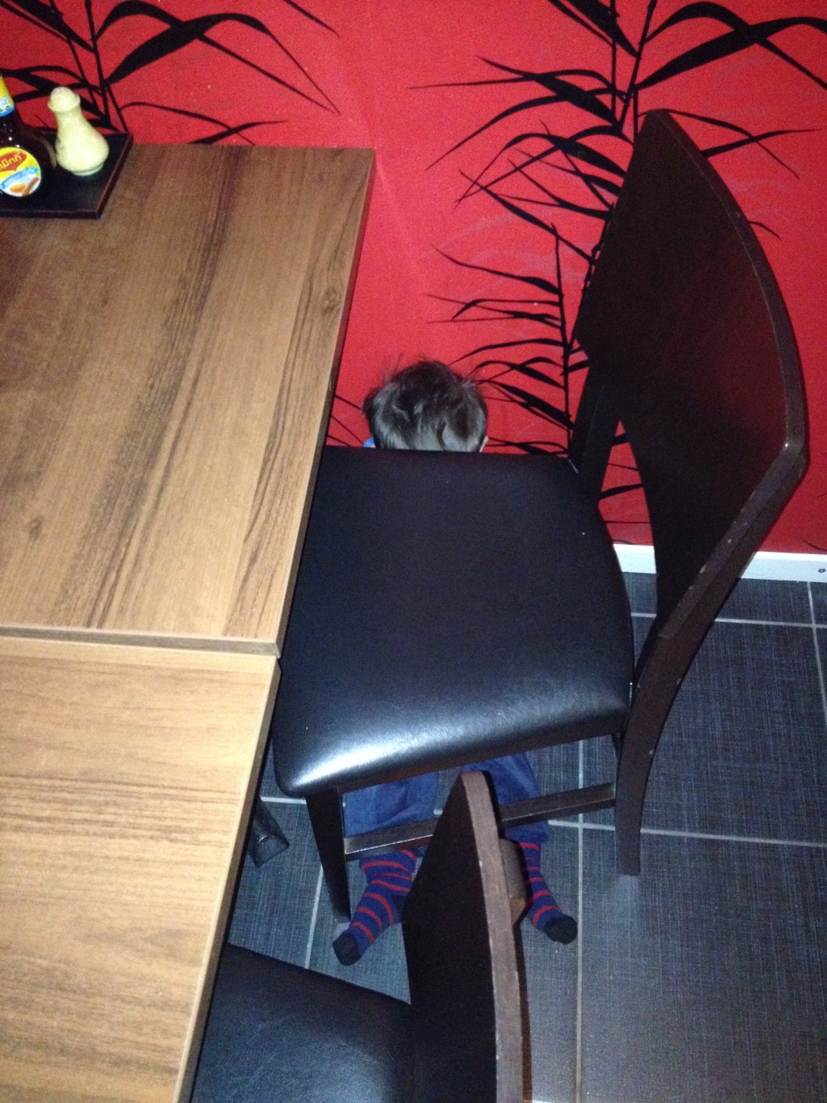Max hade sin egen stil på restaurangen.. Inte ens vid vårt bord kunde han sitta, utan under en stol vid ett annat bord!!