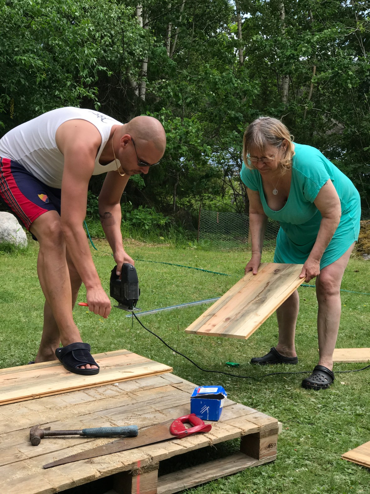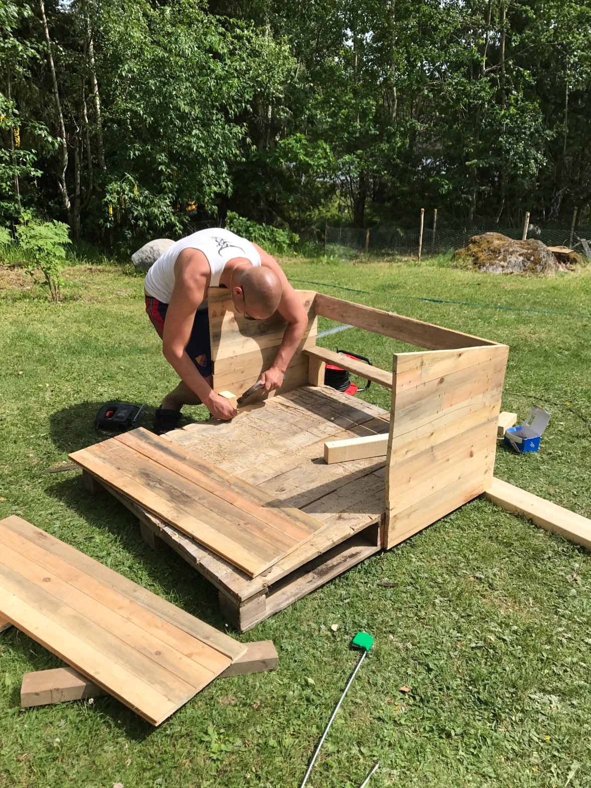 Och Nej, det är jag ju faktiskt inte. Så jag gick upp till vägen och väntade in honom. Sagt o gjort, han kunde absolut hjälpa oss. Han klippte bort hela häcken!! En ca 8-10 meter lång häck, ca 1,5 meter bred och ca 2 meter hög! Och kvar blev lite flis som vi sen krattade bort. Skit coolt!