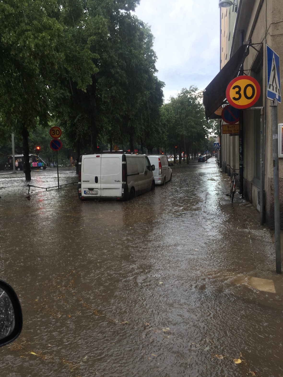 Det bara vräkte ner, R blev dyngsur av att springa 15 meter till bilen. Dessutom var det ca 25 cm vatten på gatan till bilen som han fick plumsa igenom. Det var helt sjukt! Aldrig varit med om liknande!