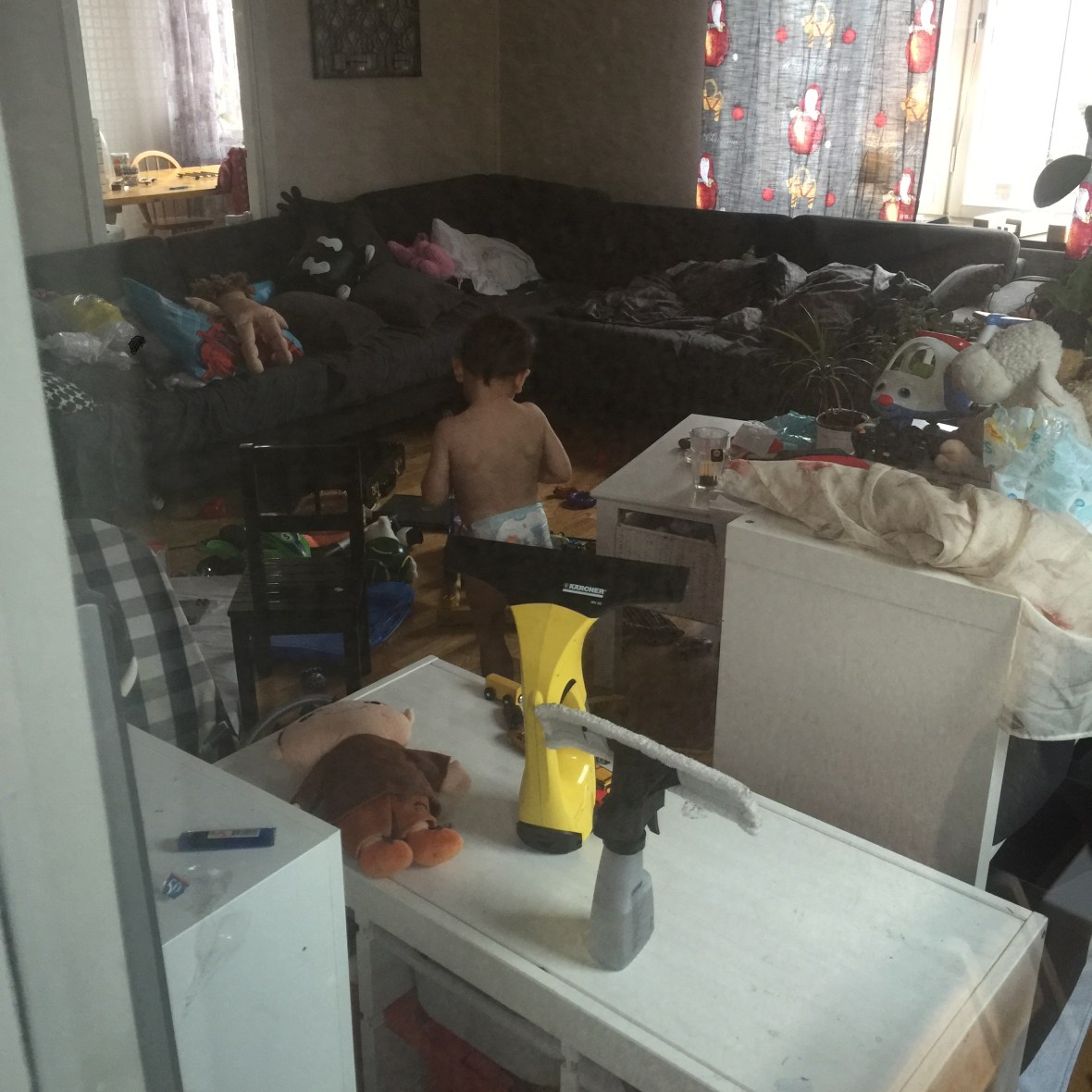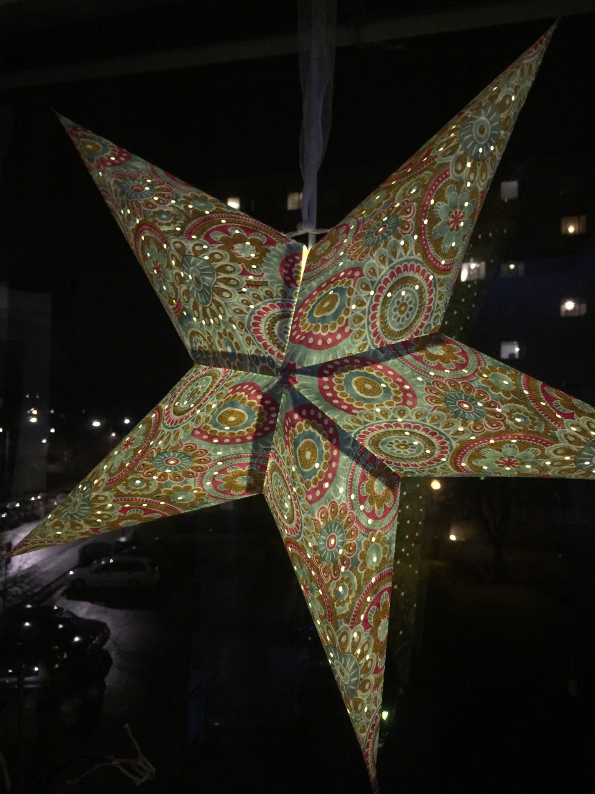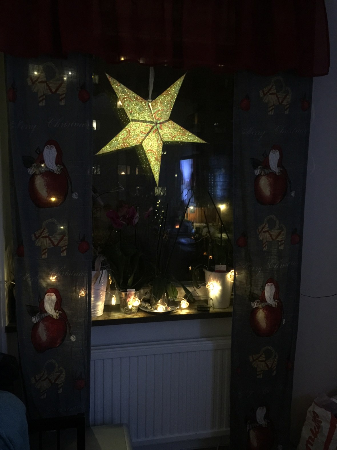 Vårt enda helt färdiga julfönster. Imorgon (idag) hämtar vi stjärnor och sånt från källaren. Så pyntas det lite på själva Första Advents dagen. Ljusslingan på balkongen ska upp oxå.