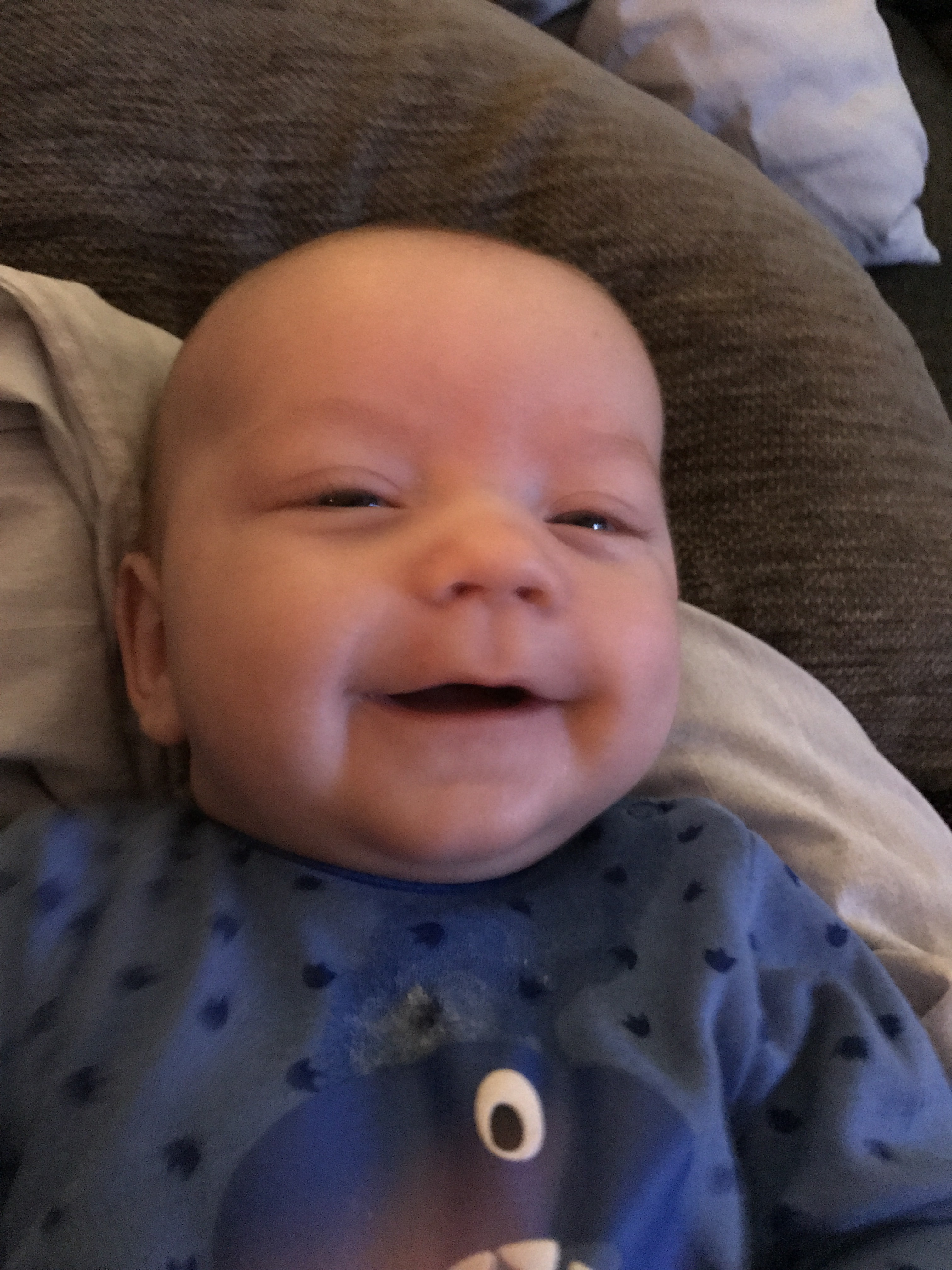 Och han är SÅÅÅÅÅ go! Verkligen en underbar bebis! Glad & ”pratsam”, söker verkligen efter mig med blicken och så fort vi får ögonkontakt så fyrar han av ett stort leende och ögonen glittrar! Han skriker nästan bara om han är riktigt trött eller vrålhungrig. Annars gör han inte mycket väsen av sig. Jag kan inte fatta att han varit hos oss redan i 3 månader! Det känns som att han alltid funnits hos oss samtidigt som det känns som att han föddes igår..
