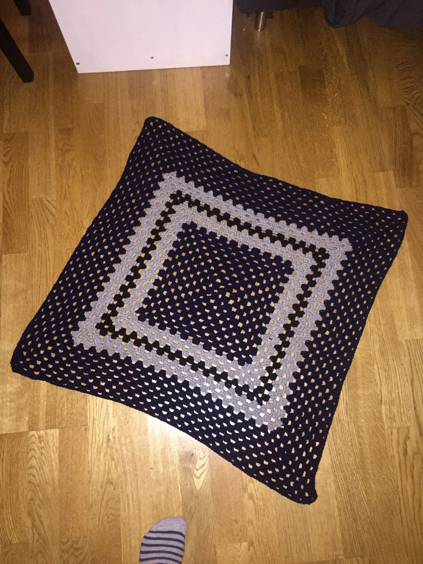 Den här är virkad i Polly-garnet från Rusta. Formen ska bli en Hexagon och det kan man tydligt se att den här inte blev. Men imorgon hoppar jag på det igen och hoppas på bättre tur och får det rätt. Hade tänkt att göra många blommor och sen sy ihop till en flodhäst eller elefant. Får se hur långt jag kommer. Min cocoon blev iaf väldigt stor. Det var stor jag ville ha den, för att slippa ”rump-påsen” och den slapp jag åtminstone. Den kommer nog vara sjukt mysig på kyliga dagar att gosa in sig i :). Ska i framtiden göra en helsvart oxå :).