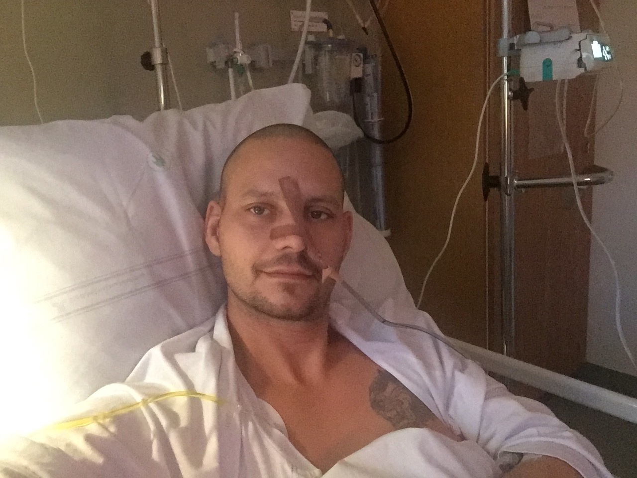 Han är nu opererad, ligger med slang genom näsan ner i magsäcken, och efter operation har han även dränage från magen.